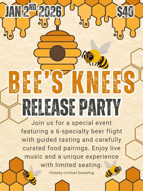 Welcome to the Bee’s Knees Release Party at Rickety Cricket Brewing! Get ready to taste the most buzz-worthy brews on January 2, 2026 as we celebrate the release of our latest creation. Enjoy a guided tasting with our Head Brewer , featuring a curated 6-beer flight paired with delicious bites designed to elevate every sip.